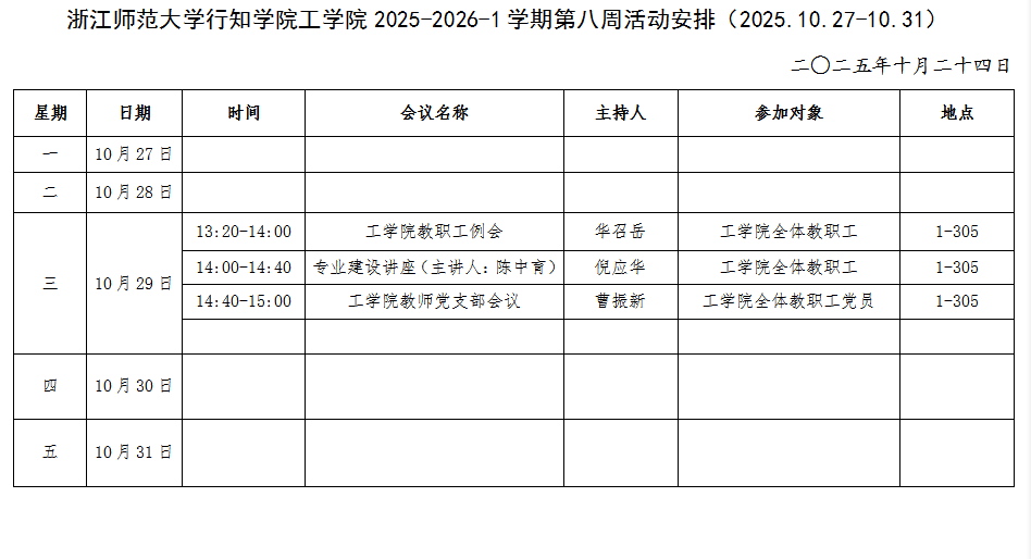 工学院 2025-2026-1 学期第八周活动安排(2025.10.27-10.31)