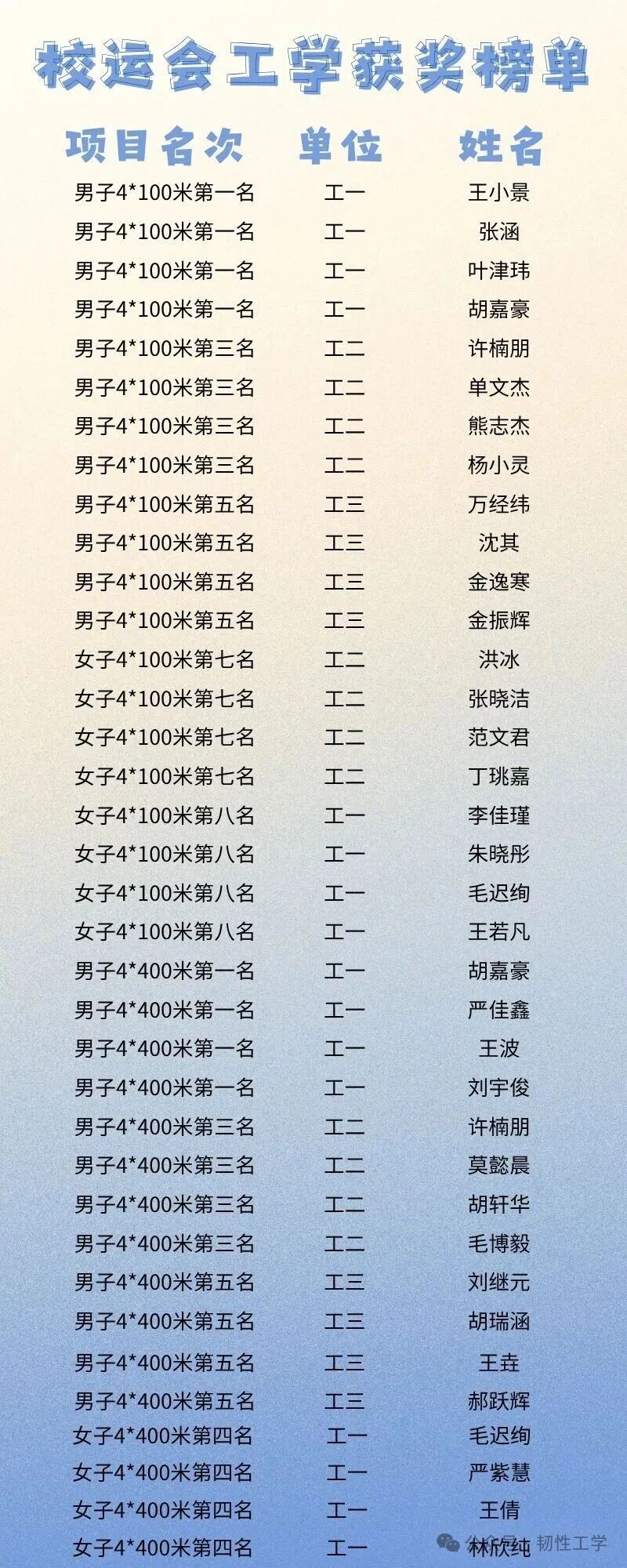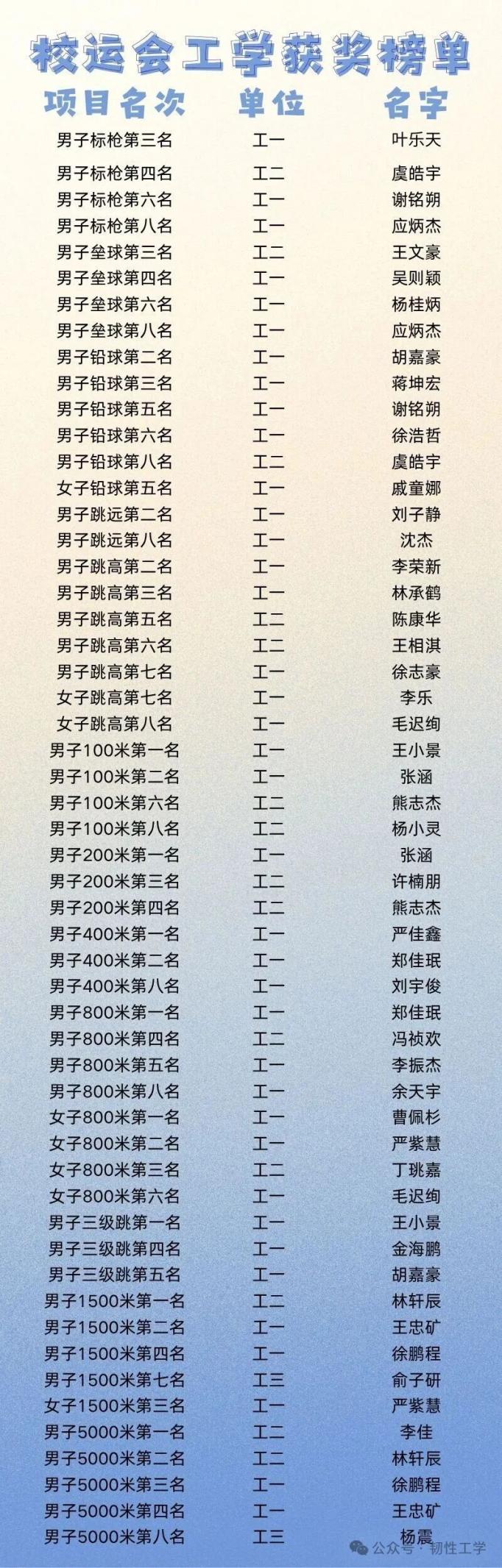 校运会工学获奖榜单:此次运动会不仅培养了学生的团队意识和集体荣誉感,还培养了同学间的友谊和互助精神。