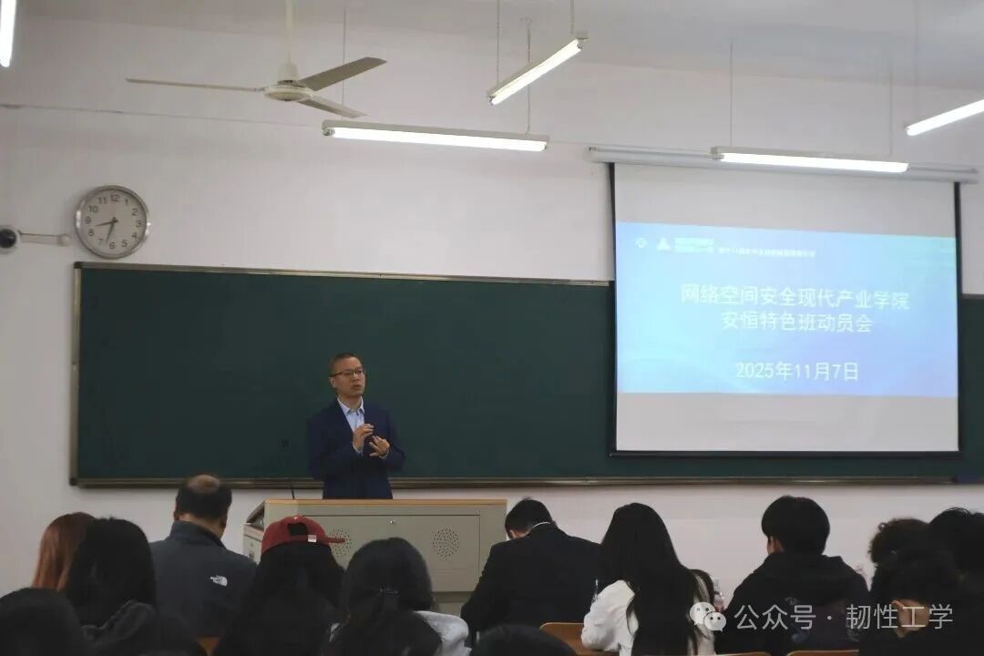 动员会上,倪应华院长宣布,学院联合安恒等5家单位成功申报省级网络安全实训基地。基地将为学生赋能,特色班同步启动选拔,学生可自主选择就业或考研发展路径,他呼吁同学们踊跃报名并全力投入。