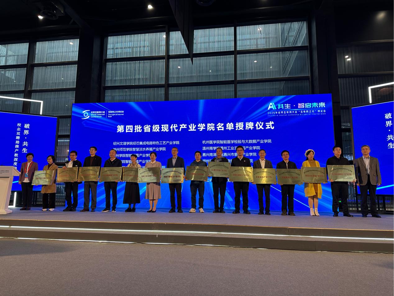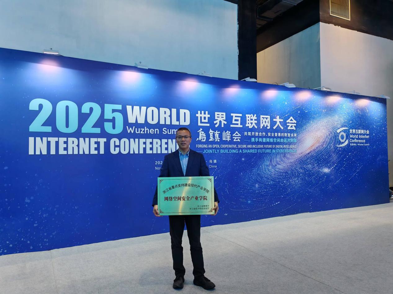在大会的重要授牌环节中,我院网络空间安全产业学院荣获“浙江省第四批重点支持建设现代产业学院”称号,标志着学院在产教融合与高层次应用型人才培养方面获得省级高度认可。学院党委委员、工学院院长、产业学院执行院长倪应华受邀出席仪式并代表学院接牌匾。